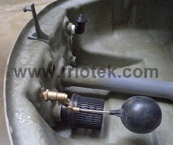 Boya de reposición de agua para reservorios de las tinas de torres de enfriamiento, condensadores evaporatívos y similares donde por efecto de la evaporación del agua se requiere reponer el agua acorde al nivel del reservorio. El mecanismo de cierre es de bronce y cuenta con una bola flotadora completamente hermética que impide el ingreso de agua vertical y/o de cualquier dirección.